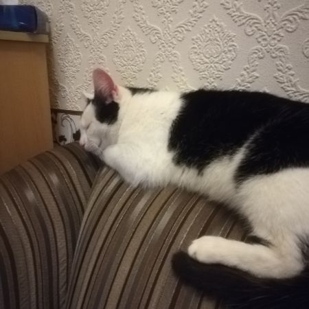 Black/white male cat found wandering with another cat, also listed, Pink nose and ears front paws are white. No collar or microchip no injuries but has sore ears from ear mites. Very friendly but nervous. Miaows a lot, we put this down to his ears which we are now fixing.