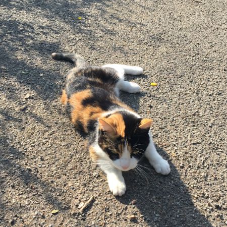 Black/white and orange young cat, yellow eyes, strong howl/meow. Very friendly.