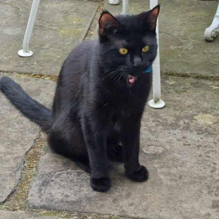 Young Black cat, with small patch of white on chest. Friendly and vocal. Has a blue collar with pink bell, with the word Reaes on it