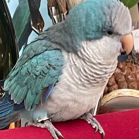 Blue monk parakeet, blue back, grey chest, metal ring around leg, found in Surbiton area