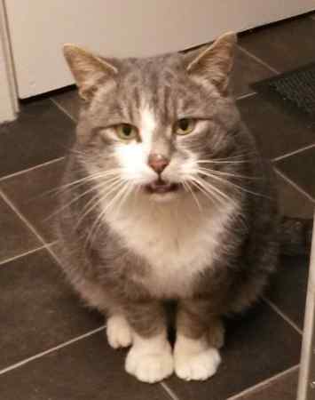 The male cat has been coming to me in Pitlochry,Aldour area for a few months now for food; he is not neutered,i think he is a young cat and is friendly : has built up enough trust with me to let me stroke him. He is grey has rings on his tail with white marking chest and pawss and has a distinctive "patch" at top of his nose around the left eye area.He also has a weeping ,sore right eye .He is also quite vocal.
