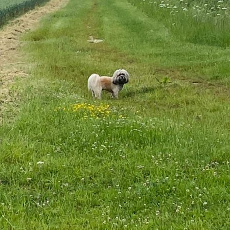 I have seen what seems to be a Lhasa Apao / Shih Tzu mix. Sadly he didn’t want picking up but is in the field where we are currently staying in our air bnb in Stoke Charity.