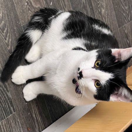 Oscar is white with black spots. it has a black spot on its nose and one on its belly. he is about 9 months old