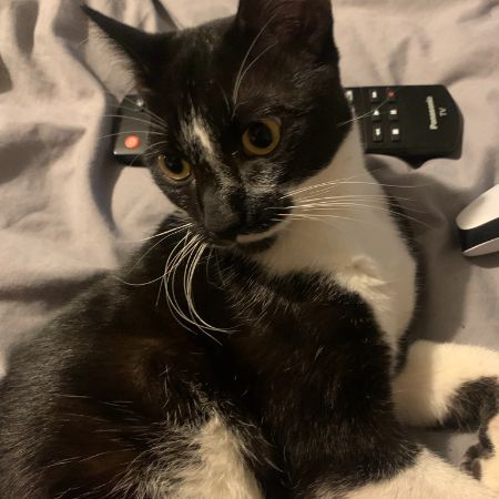 Small cat under one years old. White tummy and paws with small white patch on face.