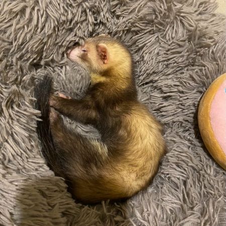 The ferret is friendly can be shy is dark brown with orange