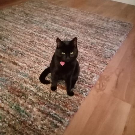 Audrey is a medium size, all black cat with a long tail. She can be a little timid. Last seen wearing a navy and pink collar with a silver heart shaped tag attached. She is microchipped. .