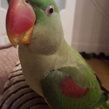 Alexandrine Parrot/parakeet all green female with dark red feathers on wing and ID ring on left foot