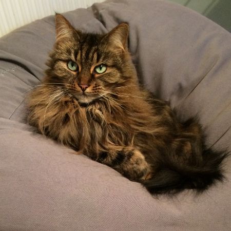 Lola is a domestic long haired tabby, very small, but her fur coat makes har look a lot larger. Her 'meow' is very quiet.