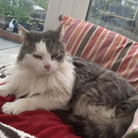 Baffi is grey and white long haired, he is neutered, microchipped not upto date