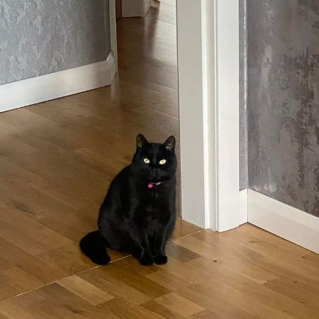 Tina is a black cat, she has a few white hairs on her chest only. She is very shy. She was wearing a bright yellow collar.