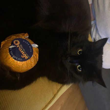 her name is belle, she is quite ignorant. she is super fluffy with bright green eyes and a slight white patch on her belly.