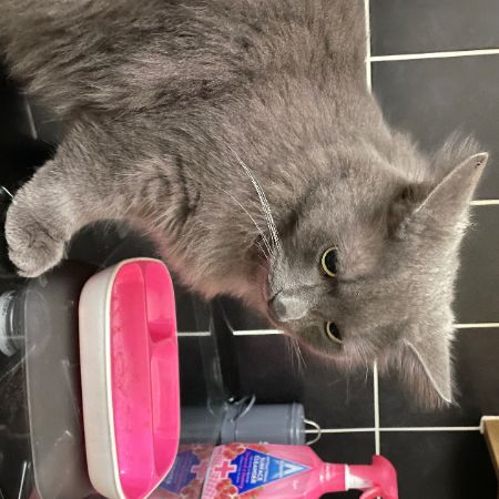 Gizmo is a very large fluffy grey long haired cat with a white patch on his chest. He is very chatty but can be timid around strangers.
