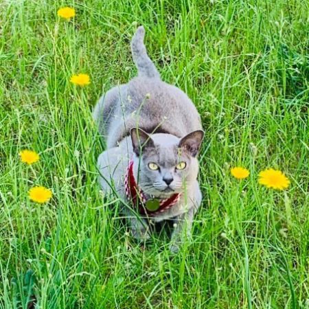 Calypso has exceedingly soft, grey fur, lovely slender tail, is super friendly, athletic, graceful and has an independent and loving character. Communicates her wishes, like having her tummy rubbed or her back scratched. May hide when people reach for her. She may have ended up far from home (Summertown, Oxford) and can't find her way home. She's chipped and used to have a red collar that said 'I'm microchipped'. She had a tag with her name on it and my mobile number.