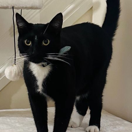 He is mostly black but has a little patch of white between his eyes, a white belly and paws. He's very curious and initially wary but a friendly cat.