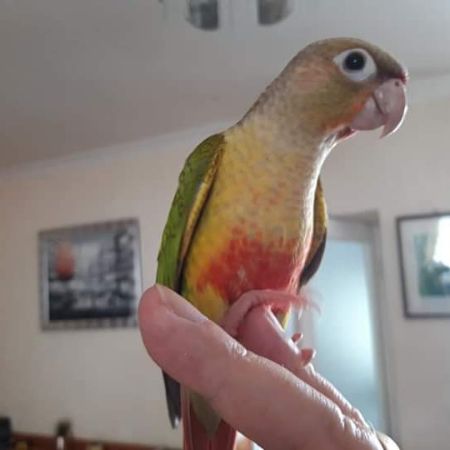Pineapple conure. Pale beak. Green back with yellow and red markings on chest.