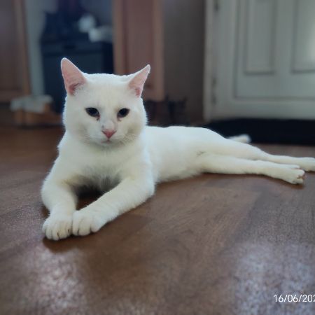 He is a 9 month old kitten, pure white, lovely blue eyes, he managed to escape out the window in a hot night, he is new to the area about a week,