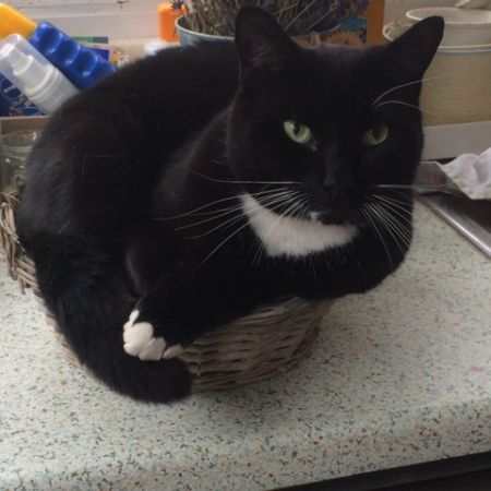 Herbie is a large black and white cat. He has white paws and belly and chest and white whiskers. He is friendly but sometimes shy and usually very vocal.