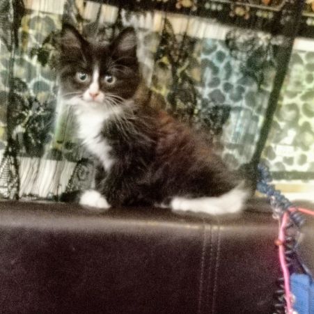 He is black with white paws and chest, tuxedo , long fluffy coat.. white strip down face nose.