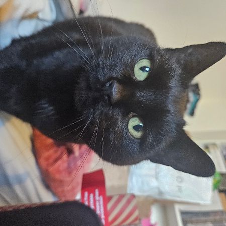 All black apart from a few white hairs on chest. Very timid and shy, will hide if not in familiar surroundings. Can't jump very well and may be struggling to walk as has arthritis and has been without medication.