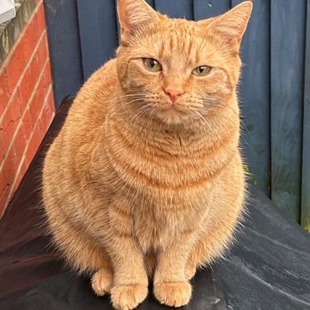 Full ginger cat. Small in size but with saggy tummy. Caramel and ginger. Striped tail and legs, tortoise shell back.