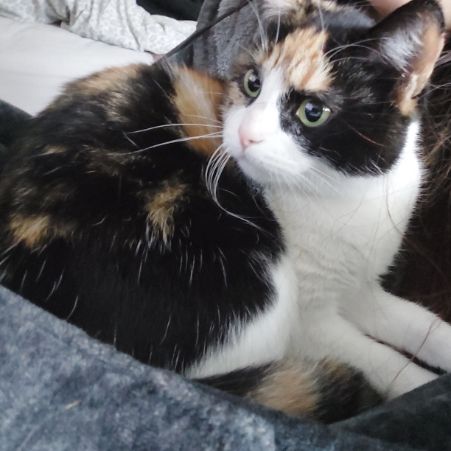 Calico cat, green yellowish eyes, mostly black till the end, one ear is ginger and the other one black, belly is white and has a ginger spot in one arm. Pink nose, left foot is black with 3 black toe beans, the 4th is has a bit of black and white the other one is just white