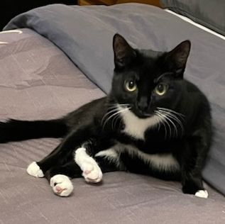 Luna is a black and white, yellow eyes and white whiskers. She has a slight white line on her top lip and does not have a collar