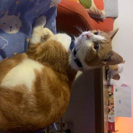 Wearing a black sparkly collar. Small cat. Nervous. Darker ginger one white front leg