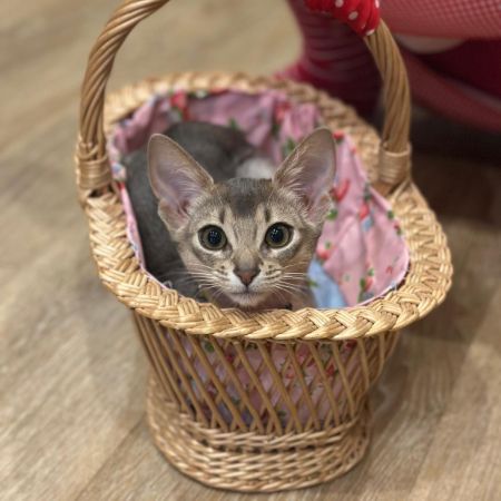 Small silver Abyssinian female - kitten. Friendly but timid. Greets you by nuzzling her face on yours. Microchipped and neutered