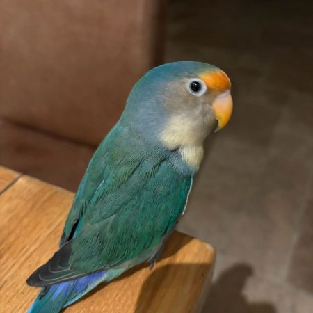 ‘Bazinga’ has an orangy - peach face, a cream belly and a mixture of blue and green feathers throughout his coat creating a turquoise colour, on the tip of his wings he has a bit of black.