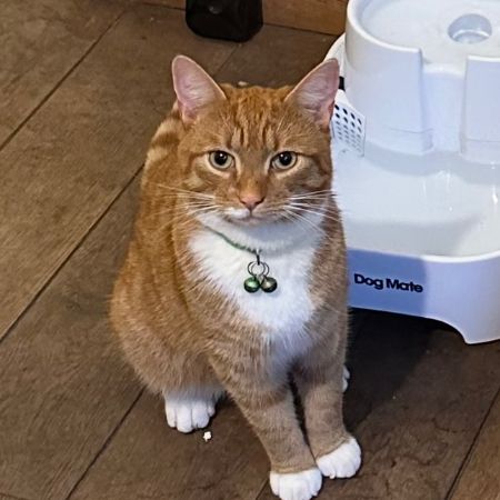 Thick feeling tail, half a white moustache, small nose and green eyes. He’s very curious and lives with dogs so won’t necessarily be scared of them.