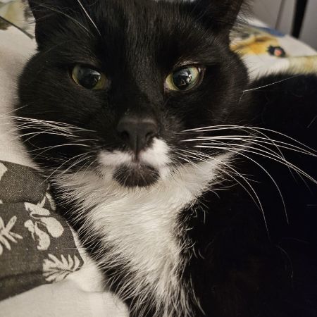 She is black and white cat. She has black dot on her chin. Small/medium size.