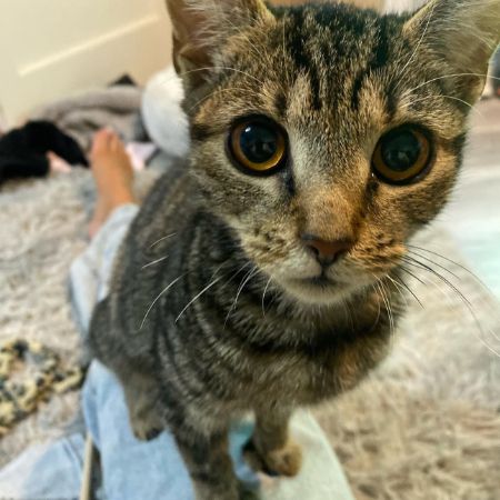 She had orange eyes, stripes in her back and spots in her belly. She also has five toes on each paw.