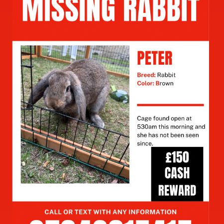 Report your missing rabbit on our Rabbit Registers for free and we will do a pet match to display any rabbits which match in the area. You can also create and print your lost rabbit poster. Report a missing rabbit here