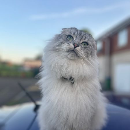 Scottish fold, Green eyes, long whiskers, fluffy full tail and full fluffy coat which is grey and white. He is curious but will be scared as he’s in an unfamiliar area.
