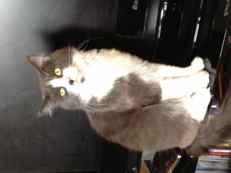 long grey and white fur, grey spot under his chin, very friendly and loves a cuddle and will come to you if you call his name