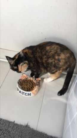 Patch is a tortoiseshell with an orange patch on the right side of her face and black and brown on the left side. She is black and brown all over and her left leg is light brown with a white paw.