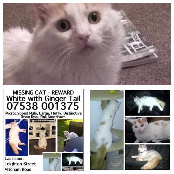 Last seen near McCarthy Cars on Micham Road, White with Ginger Tail (big-ish cat), Ginger spots on one side of body and ginger patches above eyes, very vocal
