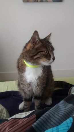 yellow (celadon) Collar, frendlly, meowing loudly,