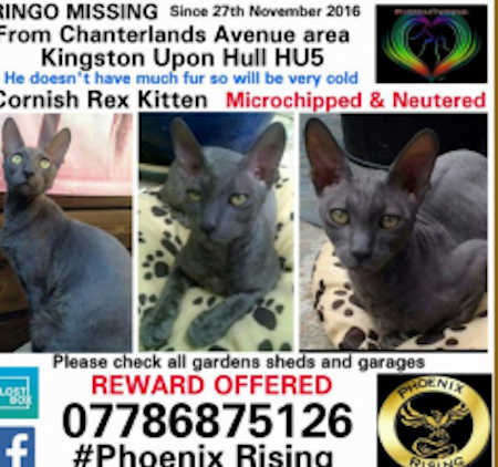 Missing LOST stolen Cornish Rex 9 months old . blue/grey in colour.hardly any fur as it hasn't grown curly yet.large ears. green eyes.slight receding right lip .he went missing from the HU5 area hull.wemt missing 27th November 2016