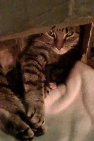 Small tabby, grey, but dark stripe down her back, black banding on her tail, looks like a scottish wild cat.