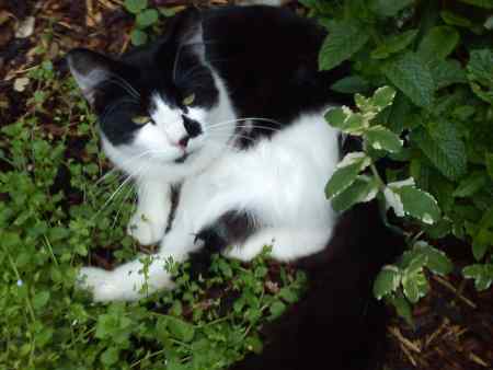 Black and white, long haired cat.. Black mask markings with blacks markings on his nose.