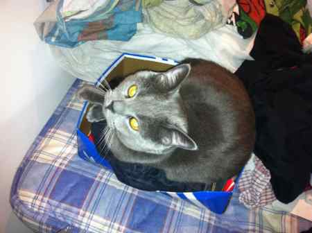 Large, silver-grey. He's not used to being outside, so is probably very scared.
