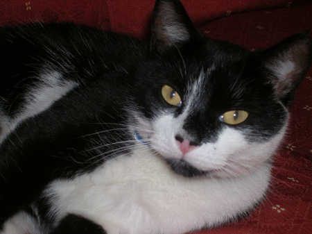 His name is Sweep, he has a blue collar with a bell on but that may have come off now. He is very friendly, a real charmer! He's a little chubby and walks a bit funny.