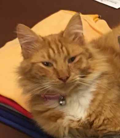 He is a ginger boy with a white chest and white paws. He is long haired with a bushy tail. He is quite large & has golden-yellow eyes. He has a blue patterned colar with a bell on and a black bow tie with white spots is also attached to the collar.