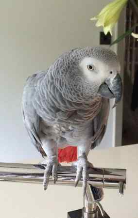 African Grey with Red Tail, slightly pulled feathers on his chest