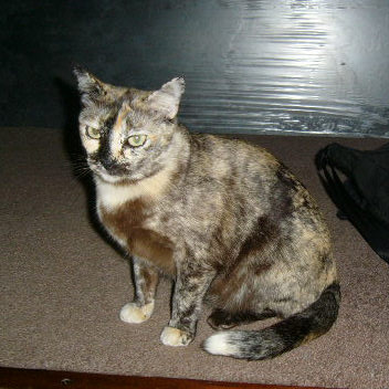 Small tortoiseshell cat - cream and brown speckled coat with black stripe down her face. White tip on her tail.