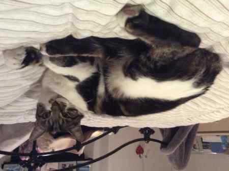 Large tabby and white male cat. Tabby back and head with white chest and underneath.