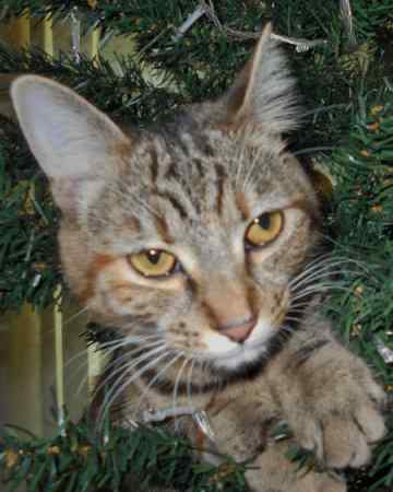 Predominantly brown tabby with orange markings in fur. Tummy area has champagne colouring. Small area whitish fur under nose and around chin. Black stripes on rear legs. One front pawpad is completely black.