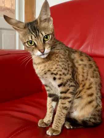 Female Savannah cat, spayed, 2 years old. Tan coat with black spots.