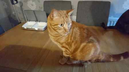 He is very dominant dark ginger 'tiger' stripes on his face. He is predominately a dark ginger with NO white markings. He has a small scar on his right ear, and has some black whiskers amongst white ones. Often cries in reply to his name!